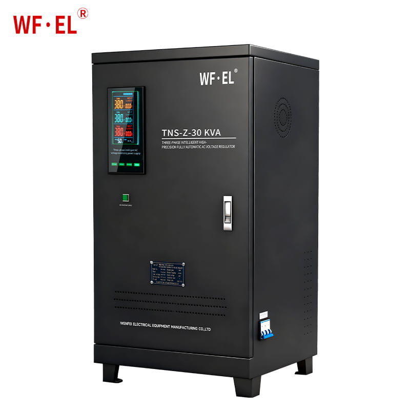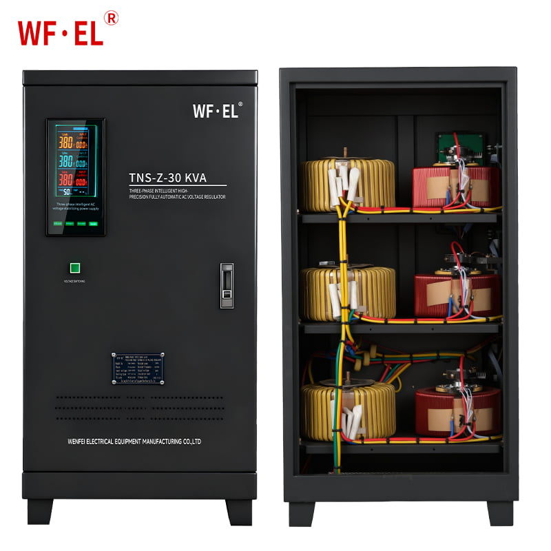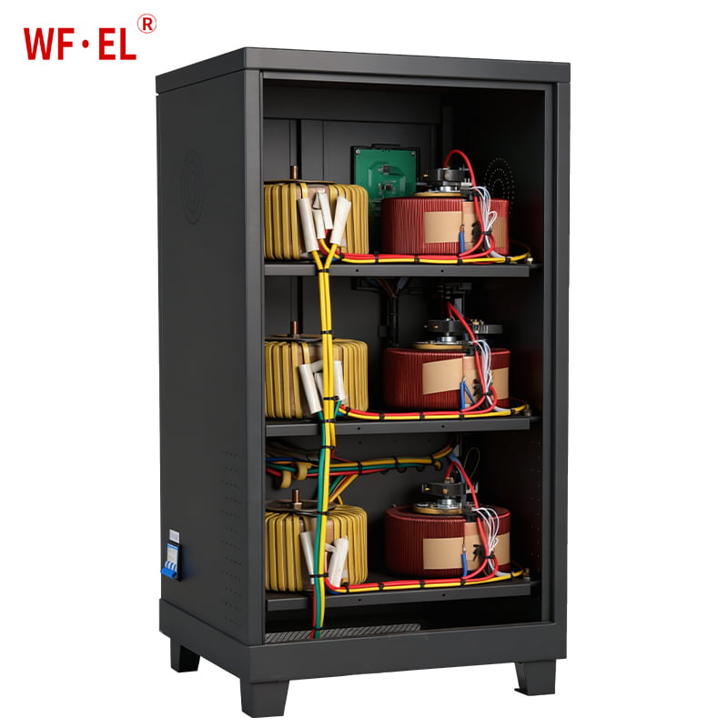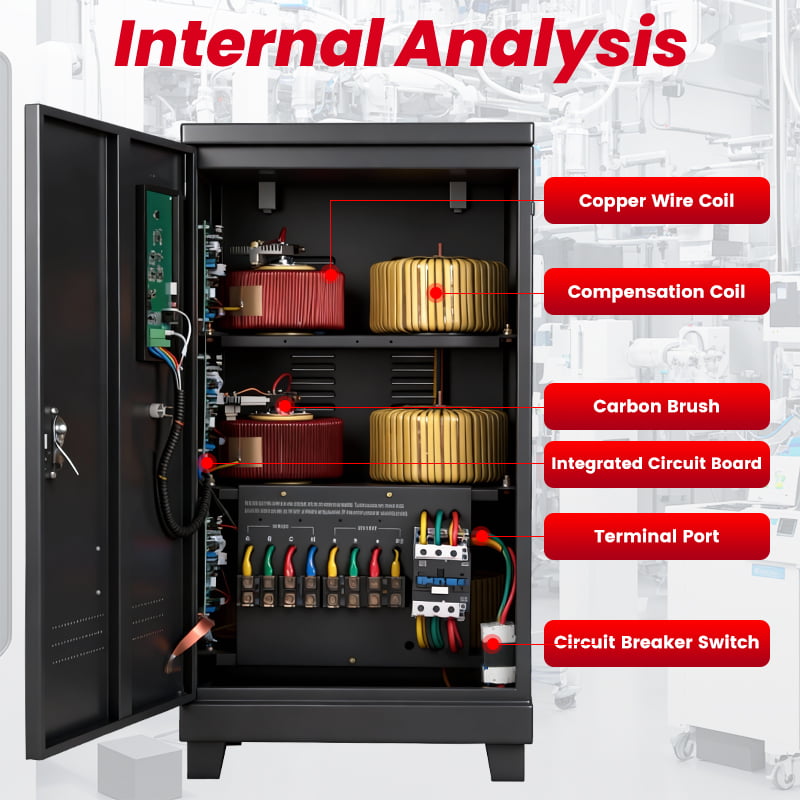 The stabilizer operates using a servo motor control system. When input voltage fluctuates, the system detects the variation and automatically drives the motor to adjust the position of the carbon brush on the autotransformer.